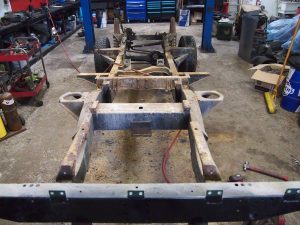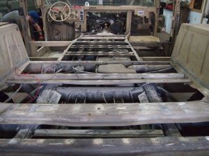 Comme vous pouvez remarquer, un étrange pare-choc avant a été installé sur ce camion, il s’agit en fait d’un pare-choc conçu spécialement pour y placer des jacks hydrauliques à des fins de travail dans les mines. L’équipe a commence par déshabiller le véhicule au complet. On coupe tout le mauvais afin de remettre du nouveau.