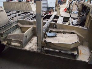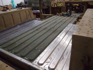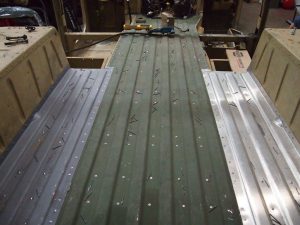 Ensuite les planchers… Fait à noter, le véhicule est fait entièrement d’aluminium de niveau militaire (mais pas comme les FORD aux dires de Vincent, en riant). Le tout est assemblé a l’aide de rivets. Donc un travail qui prend beaucoup de temps car chaque rivet doit être réinstallé au même endroit que le précédent car chez VAT, dans la mesure du possible, on respecte l’état original du véhicule.