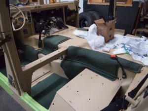 À l’intérieur, une très belle job afin de redonner le look d’origine. Installation de tapis militaires ininflammables de haute qualité qui protègent aussi d’avoir une chaleur excessive dans l’habitacle.