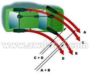 Il s’agit du meilleur système pour aller hors-route, car une fois le mécanisme engagé, la force disponible sera répartie de façon égale aux roues avants et arrières. En le désengageant par contre, vous pouvez envoyer la puissance à seulement deux roues sur quatre (généralement les roues arrières). Je reviendrai plus en profondeur sur le fonctionnement d’un différentiel dans un prochain article, mais sachez que leur fonction, en gros, est de permettre aux roues d’un même essieux de tourner à des vitesses différentes lors de virages, vu la distance variante qu’elles ont à parcourir. Donc, bien que le système s’appelle 4×4, si vous différentiels sont »ouverts », vous n’aurez que deux roues qui auront de la traction lorsque celles-ci commenceront à patiner, soit une à l’avant et une à l’arrière.
