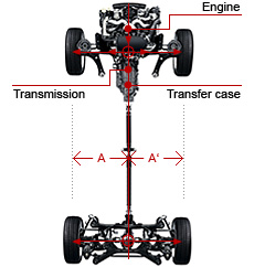 Commençons donc par ce système. Le système 4×4 est un système qui utilise des composantes mécaniques pour entraîner les roues avants et arrières d’un véhicule, d’où le nom ( 4 roues motrices sur 4 roues disponibles). C’est un système qu’on retrouvera principalement, mais pas exclusivement, sur des véhicules plus robustes, comme les camionettes et gros VUS. Essentiellement, le véhicule 4×4 ou 4WD aura un boîtier de transfert (transfer case) à l’arrière de la transmission, dans lequel un mécanisme soit à chaîne, soit à rouages (gears) entraînera les différentiels avants et arrières.