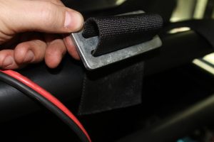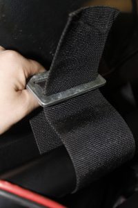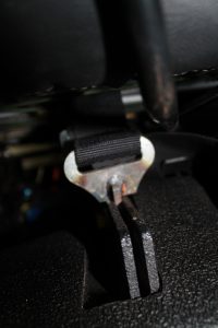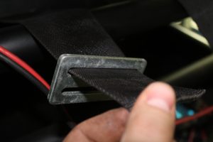 Normalement, ça donne entre 1 et 4 pouces plus bas que vos épaules. Il est très important de respecter cette règle car si l’angle de descente de la ceinture est trop prononcé, la pression vers le bas transmise sur vos épaules et votre colonne vertébrale lors d’un impact peut causer de graves dommages. Donc il n’est pas approprié que vos ceintures d’épaules soit fixées directement au sol derrière votre banc comme on voit beaucoup trop souvent dans les petites voitures… Comme sur la photo ci-dessous, à ne pas faire.