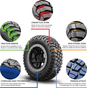 Une meilleure traction dans les roches de 8 % (même si le pneu est un MUD, au dire du représentant BF, ils sont au courant que beaucoup les utilisent pour la roche aussi).