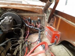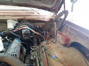 qui nous serait encore utile. Par la suite, on a repassé des fils pour remplacer ceux qui étaient abîmés et refait les connections qui en avaient besoin. On a commencé par le dessous du hood question de compartimenter notre projet. Une fois le tout bien connecté en dessous du hood, on a tout re-tapé les fils ensembles question de protéger ces derniers et de faire une belle job propre.