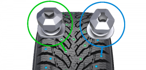 Les ingénieurs ont remarqué que les clous standards utilisés par la plupart des manufacturiers offraient des désavantages considérables. L’ajout d’un coussin entre le bas du clou et le pneu permet de ménager les surfaces en permettant au clous de se rétracter légèrement. La base carrée du clou lorsque mis sous pression venais souvent entrer en contact avec le sol ce qui réduit donc l’efficacité. Les ingénieurs ont développé une base en angle qui élimine ce problème. On retrouve aussi un pourcentage d’usure à meme le pneu.