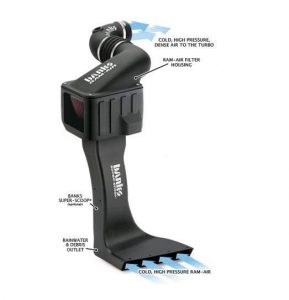Première chose, de l’air, beaucoup d’air… pour l’entrée il y a quelques options, la moins dispendieuse et un peu plus »redneck » c’est un filtre à air du genre industriel qu’on retrouve sur de la machinerie lourde. Il y a ensuite le genre ‘’quick fit’’ d’Air Aid, qui garde la base du filtre d’origine mais qui ouvre le dessus pour donner accès à plus d’air et pour finir il y a le vrai kit d’entrée d’air disponible avec ou sans Ram Air. L’important dans le choix du système de filtration est d’en trouver un qui va prendre l’air le plus possible à l’extérieur pour qu’elle soit la plus froide possible. Par contre, dans le cas d’un snorkel conventionnel qui monte à la hauteur du toit du camion, oui l’air est froid, mais pour fournir convenablement un diesel de pickup full-size, ça prendrait un tuyau d’au moins 4’’… Pas besoin de dire que ça fait massif…