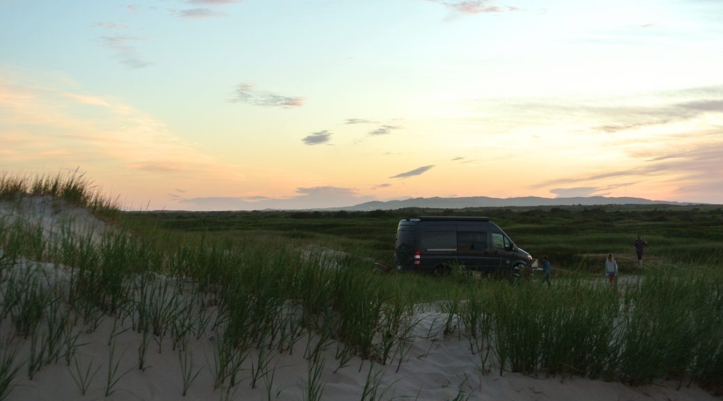 Les îles, et surtout leurs habitants, sont des plus accueillants. Immédiatement débarqué du bateau, quelques locaux assis sur un bloc de béton nous saluaient de la main. J’étais prêt à parier qu’ils connaissaient l’horaire des départs et arrivées par cœur et étaient présents à chaque fois. Après une petite virée dans le coin de Havre Aubert, la journée était déjà bien entamée et il était temps de trouver un endroit pour dormir. L’application Ioverlander nous donnait plusieurs possibilités et nous avions opté pour un stationnement près des dunes à l’entrée du banc. Un autre véhicule était déjà sur place et semblait installé pour la nuit. Le soleil se couchait lentement à l’horizon et nous étions entrain de préparer le souper tout en se demandant pourquoi les occupants de l’autre véhicule restaient à l’intérieur car la température était très agréable et le ciel de toute beauté. Cinq minutes plus tard, la réponse à cette question avait pris la forme d’un nuage noir de milliers de moustiques qui avaient trouvé de la chaire fraîche. Nous avons transféré nous aussi dans le véhicule aussitôt le matériel rangé. La tranquillité était revenue au matin et nous avons eu la chance d’avoir la visite de spécialistes environnementaux durant la préparation de notre déjeuner. Ils ont pris le temps de nous expliquer de quelle façon ils reconstruisaient les dunes afin de préserver les habitats naturels et les berges. Leur passion était contagieuse et les informations pertinentes.