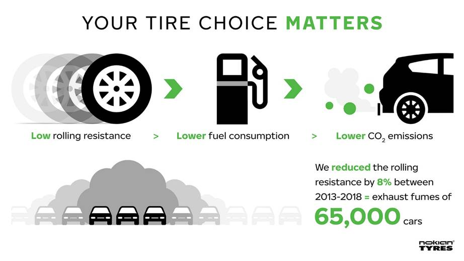 Les propriétaires de voitures ont plus de moyens de prendre des décisions écoresponsables qu’ils ne le pensent. L’un d’eux est de choisir des pneus bénéficiant d’une faible résistance au roulement, pour réduire la consommation de carburant et l’émission de CO2. Et Nokian Tyres travaille fort afin de fabriquer des pneus plus écoresponsables : depuis 2013, le fabricant de pneus scandinave a réduit la résistance au roulement de ses pneus d’en moyenne 8 %, soit l’équivalent des gaz d’échappement de 65 000 voitures.