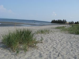 Nous avions tous le goût de se dégourdir et quelques personnes rencontrées auparavant nous avaient parlé d’une randonnée pédestre sur l’Île Boudreau.  Cette courte randonné nous avait apportés sur une pointe donnant sur le bassin aux Huîtres. De cet endroit, on pouvait apercevoir un chemin sablonneux qui se rendait jusqu’à l’autre côté du bassin et c’est à cet endroit qu’on a décidé de dormir la nuit venue. Au retour de notre randonné, nous avons rejoint le chemin qui menait sur le bord du bassin assez facilement avec notre véhicule mais le reste du sentier s’avérait de plus en plus sablonneux. Ne sachant pas trop la bonne direction à prendre pour arriver à l’endroit que nous avions vu auparavant, notre manque de momentum a fait en sorte que le camion s’est enlisé. Avec les plaques de désensablages, beaucoup de pelletage et une diminution de la pression des pneus, on a réussi à s’en sortir et croyez-moi que je n’ai pas lâché l’accélérateur temps et aussi longtemps  que notre véhicule n’était pas rendu sur la berge plus ferme. Il y a quand même pire situation que d’être pris dans le sable sur le bord de l’eau par une belle journée ensoleillée mais avec un poids de plus de 8000 lbs, la marge de jeu de notre véhicule est beaucoup plus mince. Une fois sur place, on a pris le temps de s’installer sur le bord du bassin tout en s’assurant que la marée ne viendrait pas nous chatouiller durant la nuit.