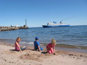Le bateau partait de Souris sur l’Île du Prince Edward le lendemain matin et le retour au même endroit sept jours plus tard. Nous avons donc filé sur la route jusqu’en soirée afin d’être plus relax le lendemain. Quelques véhicules étaient déjà stationnés à l’aréna pour la nuit en attendant leurs départs mais nous avons préféré s’installer sur le bord de la côte pour jouer un match de soccer avec les enfants et profiter de la grève. La traverse d’une durée de trois heures était particulièrement plaisante. Nous avons pu prendre l’air sur le pont avec notre chien pendant que les enfants profitaient de la petite salle de cinéma.