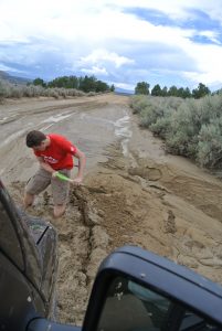 Après une étude de nos cartes, il nous restait environ 40 kilomètres jusqu’à Escalante mais une jonction apparaissait 10 kilomètres plus loin à la sortie du canyon. Si on réussissait à s’y rendre, peut-être que les conditions seraient meilleures et nous ne serions pas obligés de rebrousser les 80 kilos déjà derrière nous. Des coulées de boue et des montées rocheuses délavées se succédaient de plus en plus et m’obligeait à descendre du camion pour évaluer le tracé à chaque fois. Plus de deux heures avaient été nécessaire pour se rendre à la croisé des chemins où l’on pouvait apercevoir des enclos et une petite cabane mais aucune trace de vie. Depuis le début du trajet, nous n’avions croisé personne mais surtout, aucune empreinte de pneu nul part.