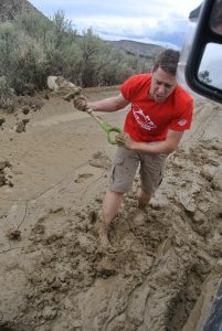 À ce point, la route semblait plus large et en meilleur état mais le doute persistait toujours car nous étions encore dans le fond du canyon et selon nos cartes, nous devions croiser la rivière une trentaine de fois. Les traces d’un véhicule ont fait leur apparition à l’horizon et nous ont donné un regain de confiance du même coup. La tension avait commencé à diminuer après une belle section et nous a même permis de rouler à près de 30 kilomètres à l’heure. On commençait même à penser arriver à Escalante avant le coucher du soleil. C’est lorsque l’on baisse la garde que les erreurs arrivent et c’est de cette façon que nous nous sommes retrouvés coincés dans une marée de boue qui a ensevelit la route sur une distance d’environ 200 pieds et d’une profondeur d’environ deux pieds. Les traces du véhicule précédant s’étaient refermées après son passage et c’est pour cette raison que nous ne l’avions pas vu. Définitivement, ce véhicule était plus léger que le nôtre. Une heure de pelletage intensif a été nécessaire pour nous extirper de cette substance visqueuse qui se refermait à chaque coup de pelle. Ce n’était que le premier croisement de la rivière…
