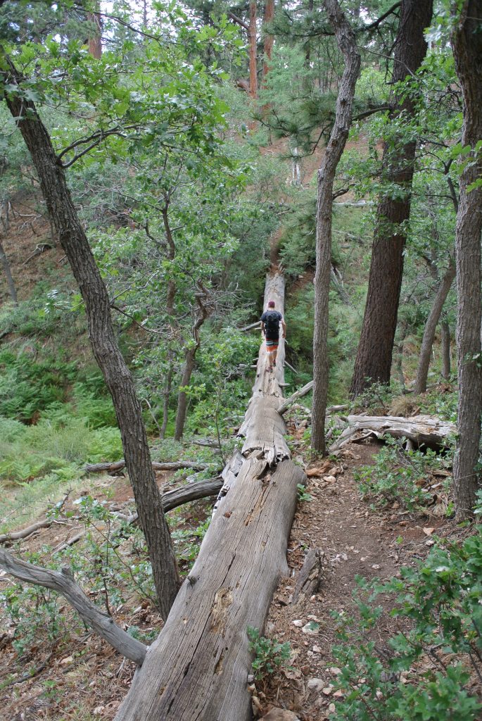 De retour sur le tracé principal, nous sommes arrivés un peu plus loin à un embranchement situé au pied de la montagne. Les indications nous donnaient le choix d’aller à droite ou à gauche mais les deux chemins se recroisaient au sommet selon le plan. Celui de droite semblait moins abrupte, nous avons donc opté pour celui-là. Finalement, l’ascension d’une dizaine de kilomètres était digne des routes de l’impossible. Un précipice de chaque côté pour la première partie suivi d’une succession de courbes à flanc de montagne nous apportait sur le plateau principal. Une fois en haut, la vue et la route étaient splendides, ce qui a amoindri quelque peu le vertige de ceux et surtout celles qui ont moins aimé le trajet. Dehors, le tonnerre et la foudre s’en donnaient à cœur joie mais on n’y portait de moins en moins attention, puisque les derniers jours avaient été semblables. Les arbres abattus et brûlés par la foudre sont monnaie courante dans la région. La végétation était presque inexistante outre les petits arbustes secs, portrait type des déserts arides de l’Arizona et de l’Utah. La route était sablonneuse et confortable, le genre de route que je roulerais pendant des jours sans me lasser.