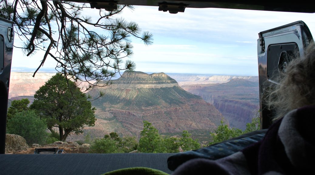Mais bien sûr!  Le bureau des permis de camping sauvage est situé à deux kilomètres avant le visitor center et c’est aussi le départ d’un sentier pédestre nommé le Transept trail qui longe le canyon jusqu’à Bright Angel Point(endroit le plus achalandé du north rim). Donc, nous avons pu diner tranquillement dans le stationnement avec toutes les commodités à notre porté avant d’entreprendre notre randonné. Le tracé du transept trail est vraiment plaisant et chaque nouveau point de vue nous coupe le souffle. Même si le canyon se ressemble beaucoup d’un endroit à l’autre, sa beauté est grandiose. Nous n’avons croisé que quelque personnes durant notre marche et ce n’est qu’une fois rendu au visitor center que nous avons fait face à une légère foule. Poussons l’audace encore d’un cran et admettons que vous voulez avoir le Canyon à vous seul, quoi faire?