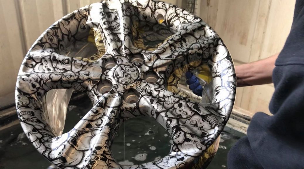 Étape 1 : La première étape comme dans beaucoup de domaine est la préparation. L’hydrographie est une technique de peinture, il est donc primordial d’avoir une surface exempte d’impuretés avant d’appliquer le procédé. Dans le cas présent, les roues ont été »sandblastées » au préalable.