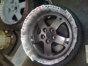 Étape 1 : La première étape comme dans beaucoup de domaine est la préparation. L’hydrographie est une technique de peinture, il est donc primordial d’avoir une surface exempte d’impuretés avant d’appliquer le procédé. Dans le cas présent, les roues ont été »sandblastées » au préalable.
